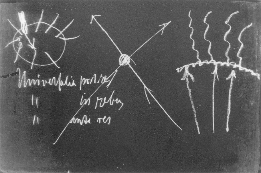 But then there is the fact that what is spread out in things, lives individualized, again points to what I characterized yesterday as lying in Plotinianism, as the actually intelligible world. Here again are the same contents that are in things, according to things in the human soul, identical in content, different in form, contained again in a different form, but again with the same content: these are the universalia ante res, before things. These are the universals as they are contained in the divine mind and in the minds of the servants of the divine, the angelic beings.