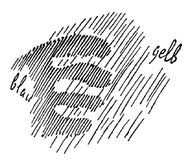 Nun will ich ein anderes Schema aufzeichnen. Nehmen Sie das Folgende. Bitte, ich will jetzt das Gehirn recht drastisch zeichnen, wie das Löcher läßt (blau). Da sei die Gehirnmasse, da lasse es die Löcher, und dahinein in diese Löcher geht das Seelenleben (gelb). Dieses Seelenleben, das setzt sich aber vor den Löchern fort. Da kommen wir in die ja natürlich nur in der Nähe des Menschen sichtbare, aber ins Unbestimmte auslaufende Menschenaura hinein.
