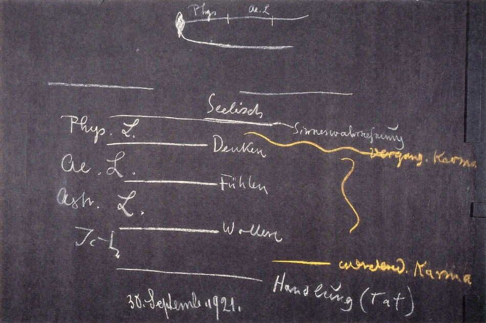 [ 21 ] You see, here on the other side we experience our karma in the making (see diagram on page 62). Between wanting and acting, we experience our karma in the making. Both then come together in our imaginative consciousness: past and future karma, that which weaves and lives within us and continues to weave beneath the threshold above which lie our free actions, which we can live out between birth and death. Between birth and death, we live in freedom. But beneath this region of free will, of volition, which actually only exists between birth and death, there is karma, whose effects from the past we perceive when we are able to pause with our ego and our astral body in the etheric body just as it is breaking through to the physical body. And on the other hand, we perceive our karma in the making when we are able to pause in the region that lies between willing and acting, and when we are able to develop so much self-discipline through practice that we can activate ourselves inwardly in a feeling, as I would say, by taking the body to help us, activate ourselves in action; when we can activate ourselves in the spirit in feeling, when we hold fast to an action in the I.