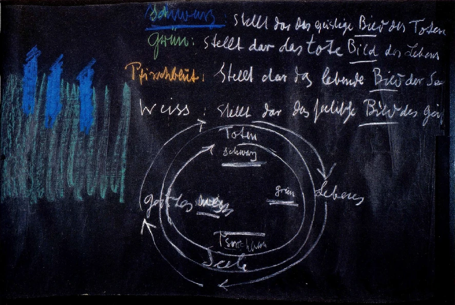 So when I take the realms of nature, the dead realm, the living realm, the animated realm, the spiritual realm, then I ascend — just as I ascend from the dead to the living, to the soul, to the spirit — I ascend: black, green, peach blossom, white. You see, as surely as I can ascend from the dead through life to the soul, to the spiritual, as surely as I have the world around me, as surely as I have this world around me in its images as I ascend: black, green, peach blossom, white. Truly, as surely as Constantine and Ferdinand and Felix and so on are my real ancestors and I can ascend through this line of ancestors, so surely can I continue through the images and have the images of this line of ancestors. I have a world before me: the mineral, plant, animal, and spiritual realms, insofar as man is spiritual. I ascend through the realities; but nature itself gives me the images of these realities. It forms itself. The colored world is not a reality; the colored world is already an image in nature itself: and the image of the dead is black, the image of the living is green, the image of the soul is peach blossom, the image of the spirit is white.