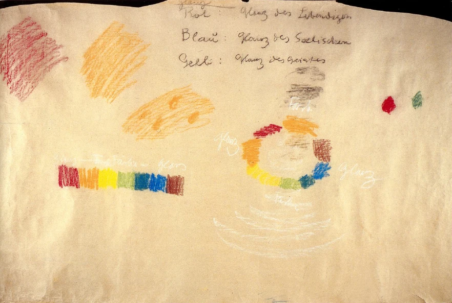 If we take the colors we found yesterday, we can say the following: Green actually always allows us, through its own essence, to do this within certain limits. Green can be limited, so to speak; we do not find it unpleasant when we paint a green surface and give it boundaries. But imagine doing the same with peach blossom. In a sense, this cannot be reconciled with painterly sensibility: peach blossom with boundaries. Peach blossom can really only be applied as a mood, without reflecting on boundaries, without actually intending to have boundaries. If you have a sense of color, you can experience this. Think, for example, of any green color: it is quite easy to imagine gaming tables with green covers. Because gaming is a limited, pedantic activity, something primal and philistine, it is possible to imagine such an arrangement, a room with gaming tables covered in green. But I think it would be enough to make you run away if someone invited you to play tarot on tables with purple inlays. On the other hand, in a purple room, for example, which is entirely wallpapered in purple, it is quite possible to Let's say, mystical talk, in the best and worst sense. In this respect, colors are not anti-moral, but amoral. So we notice that something follows from the nature of color itself, that color has an inner character, whereby green can be limited; purple, peach blossom, and incarnate tend to blur into the indefinite.