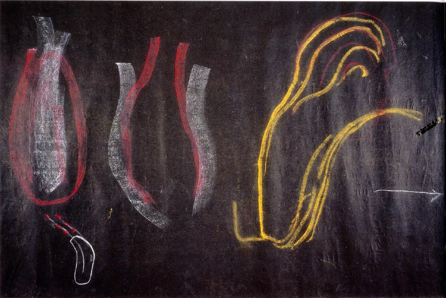 The vowel element is the soul playing on this musical instrument. When you observe the consonant and vowel element of speech, you actually discover a self-expression of the human being in each word and tone. Through the vowels, the soul of man plays on the “consonantism” of the human bodily instrument. If we examine the speech of modern-day civilization and culture, we notice that, to a large extent, the soul makes use of the brain, the head-nerve organism, when it utters vowels. This was not the case to such an extent in earlier times of human evolution. Let me sketch on the blackboard what takes place in the human head-nerve organism.