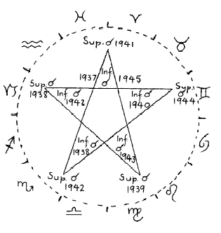 A close comparison shows that this corner of the pentagram has slightly moved backward since 1937. In 1937 it was exactly between the head of Ram and one of the Fishes. Now in 1945 it has completely entered Fishes, and during the coming 100 to 120 years this corner will slowly move through Fishes. Not only this corner is in movement but also the whole pentagram is slowly turning in the Zodiac like the spokes of a gigantic cosmic wheel. We live at a time during which this one spoke of the wheel is turning away from Ram and entering Fishes. Only after about 300 years will humanity witness this event again. Just as the countenance of a human being betrays his inner emotions and experiences, this event expresses the inner life of the spiritual worlds. In the sphere of Venus, we can meet the spiritual beings who are the Guides and Guardians of human communities; for example, of the nations. Thus, if the “five-pointed star” of Venus (which is the pentagram [created by] the conjunctions of Venus with the Sun) starts a new cycle by entering Fishes, we must expect it to be an expression of great decisions in the sphere of the Folk-Spirits. In looking into the events in the sky, we might say that we can perceive something like a great council of the Folk-Spirits because of the alarming situation of humanity on Earth.