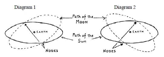 In the two diagrams above, the solid circle represents the apparent path of the Sun around the Earth, and the dotted circle is that of the Moon around the Earth in the center. The drawing shows the two circles as if seen from a standpoint outside and above the sphere of movement of Sun and Moon. If, therefore, we can place ourselves into the center, where the Earth is indicated, we can create the proper imagination. Diagram I shows the position of the path of the Moon and the Nodes at a certain moment. Then after some time (diagram 2), this circle and the Nodes have moved backward and are in a different position.