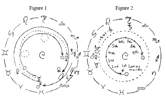 Figure 1 below shows the movements of the planets and of the Sun during the ten lunar months of Tycho de Brahe’s embryonic development. Saturn and Jupiter can be seen making loops, but not moving out of their constellations. Mars starts in Archer, moves through Goat and Waterman, then makes a loop in Waterman and proceeds after this to Fishes. Furthermore, we can see Venus starting in Fishes and moving through the whole Zodiac to Waterman. The Sun goes from Fishes to Archer and Mercury moves about the same way. During this time Mercury makes two loops that are indicated in the drawing.